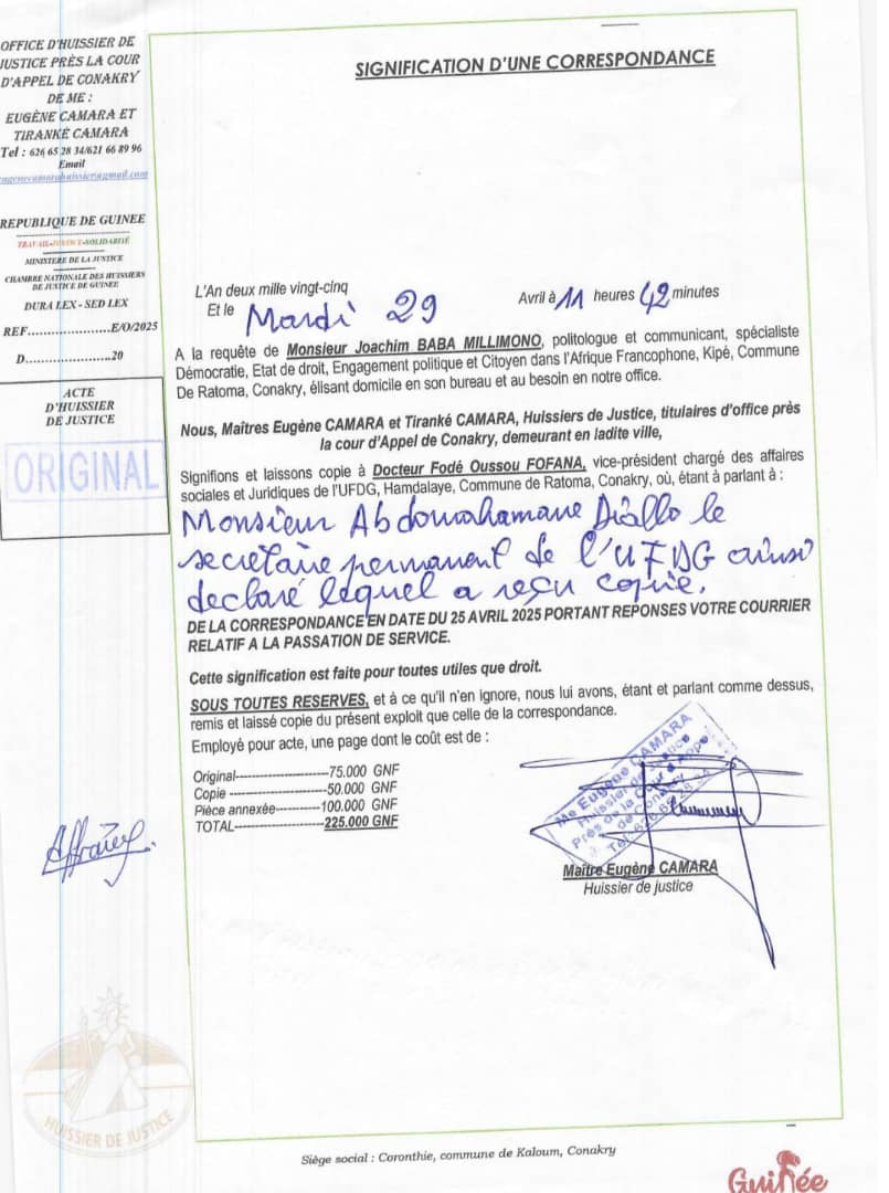 Dans une correspondance officiellement signifiĂ©e au parti par voie d’huissier, l’ex-coordinateur dĂ©nonce une absence de procĂ©dure Ă©quitable et demande que justice lui soit rendue au sein de l’union des forces dĂ©mocratiques de GuinĂ©e.