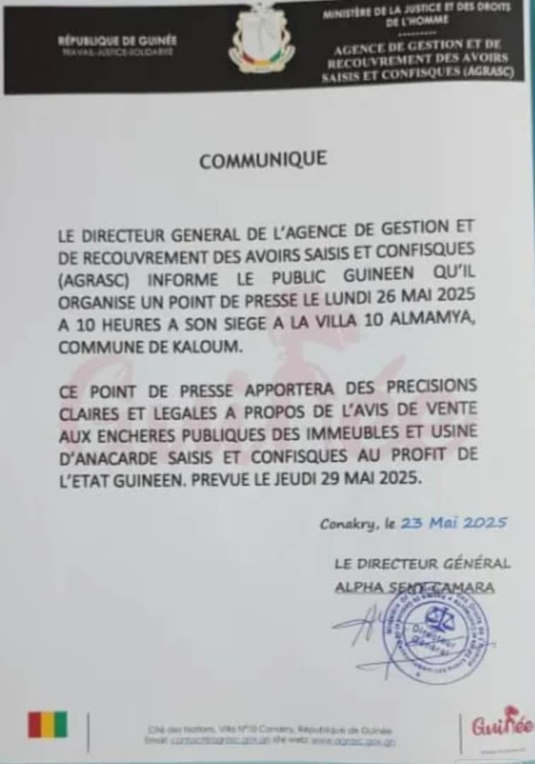 Face à cette controverse, le Directeur général de l’AGRASC, Alpha Seny Camara, donnera un point de presse le lundi, 26 mai 2025 à 10 heures, au siège de l’agence situé à la Villa 10, dans le quartier Almamya, commune de Kaloum.