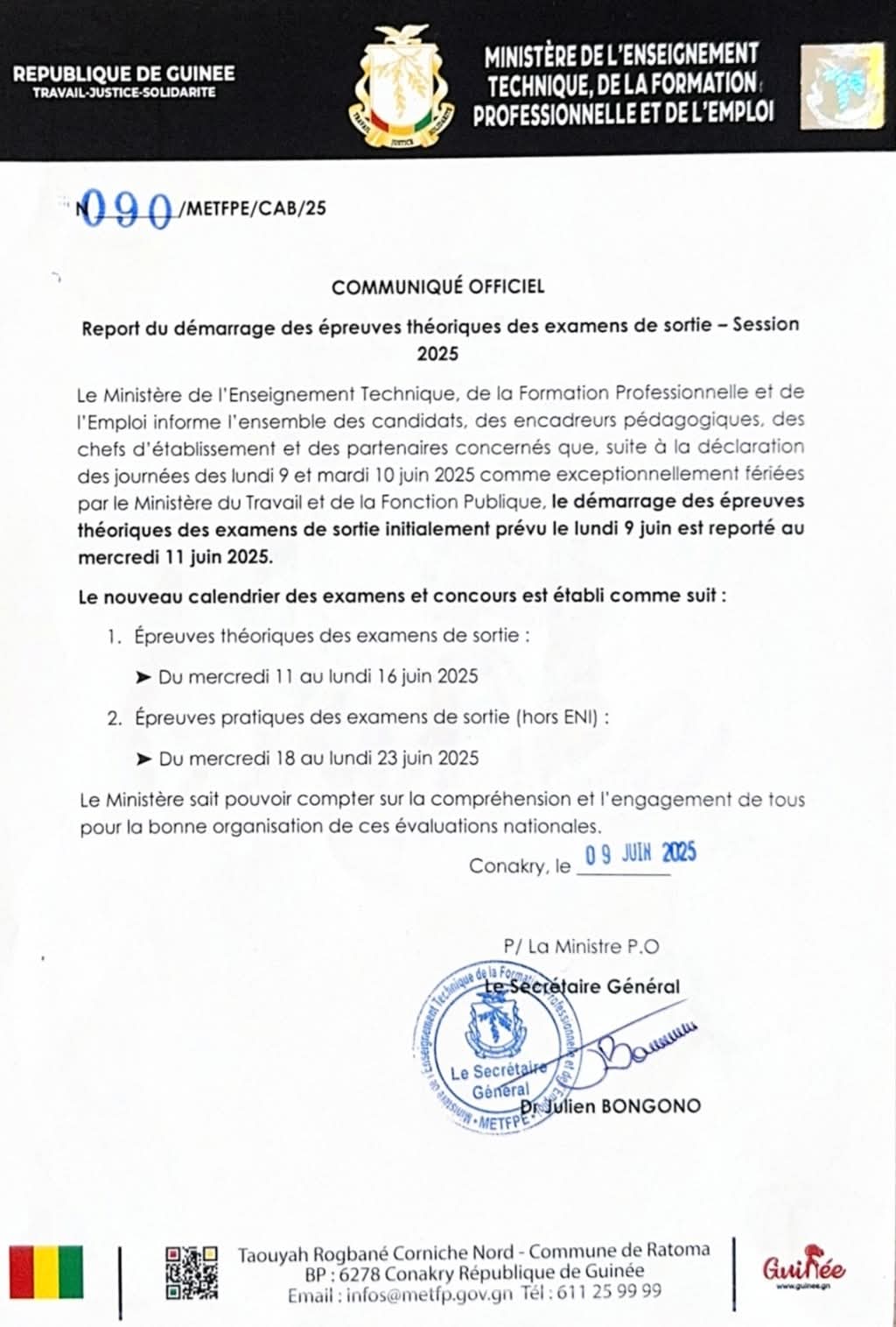 Le Ministère de l’Enseignement Technique, de la Formation Professionnelle et de l’Emploi (METFPE) a annoncé, ce 9 juin 2025, le report du démarrage des épreuves théoriques des examens de sortie, initialement prévu ce mardi, 10 juin 2025.