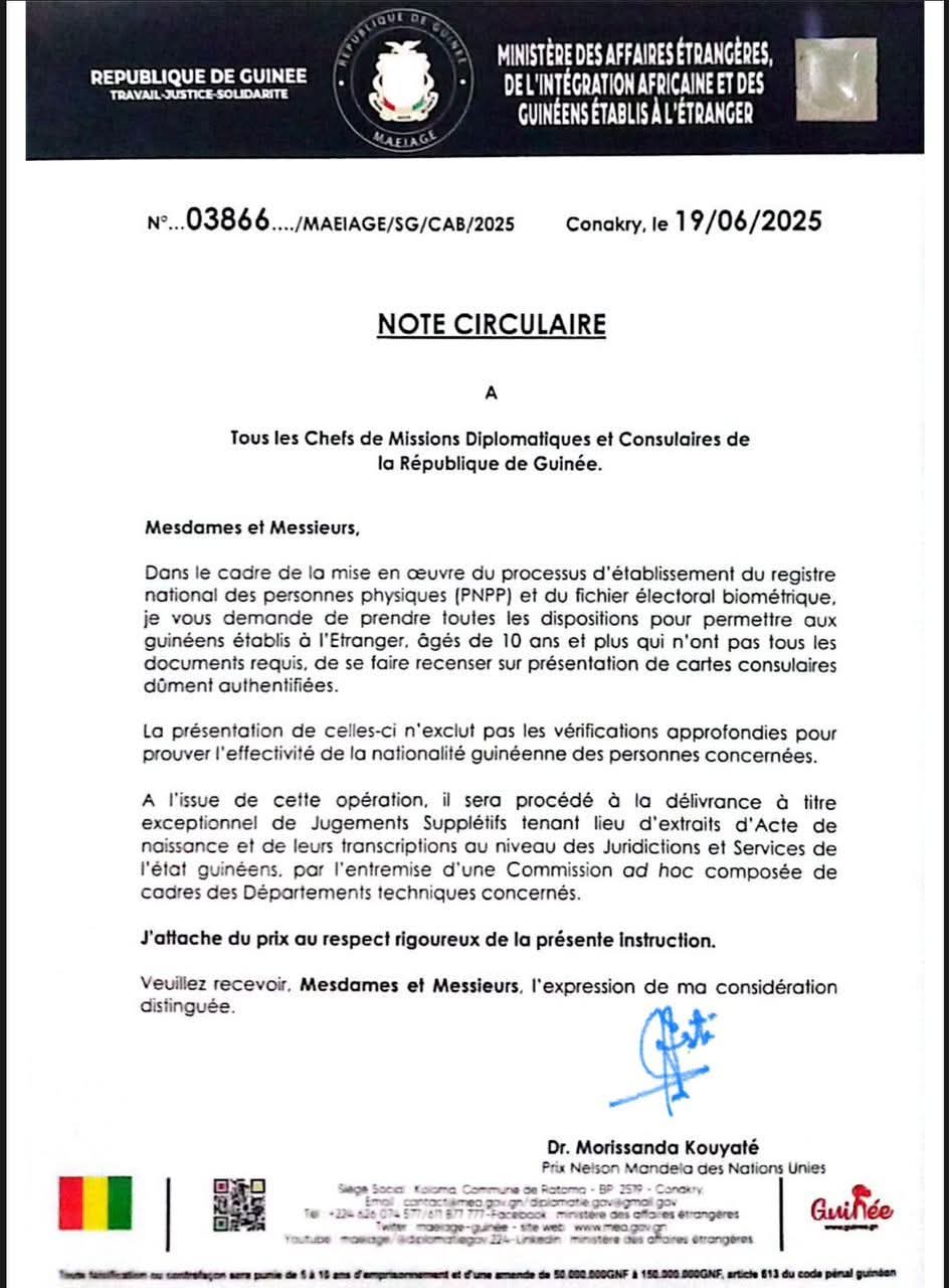 Dans une note circulaire datant du 19 juin 2025, le ministre guinéen des Affaires étrangères, Dr Morissanda Kouyaté, instruit les chefs de missions diplomatiques et consulaires à faciliter l’enregistrement des Guinéens vivant à l’étranger, âgés de 10 ans et plus, même en l’absence de certains documents.