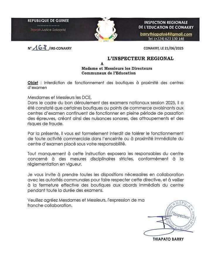 À quelques heures du lancement officiel des épreuves, l’Inspection régionale de l’éducation de Conakry a publié une circulaire ce samedi 21 juin 2025, rappelant l’interdiction stricte de toute activité commerciale aux abords immédiats des centres d’examen: « Il a été constaté que certaines boutiques et points de vente situés à proximité des centres d’examen continuent d’exercer pendant la passation des épreuves, entraînant des nuisances sonores, des attroupements incontrôlés, voire des risques potentiels de fraude », souligne le document signé par l’Inspecteur régional, Thiapato Barry.