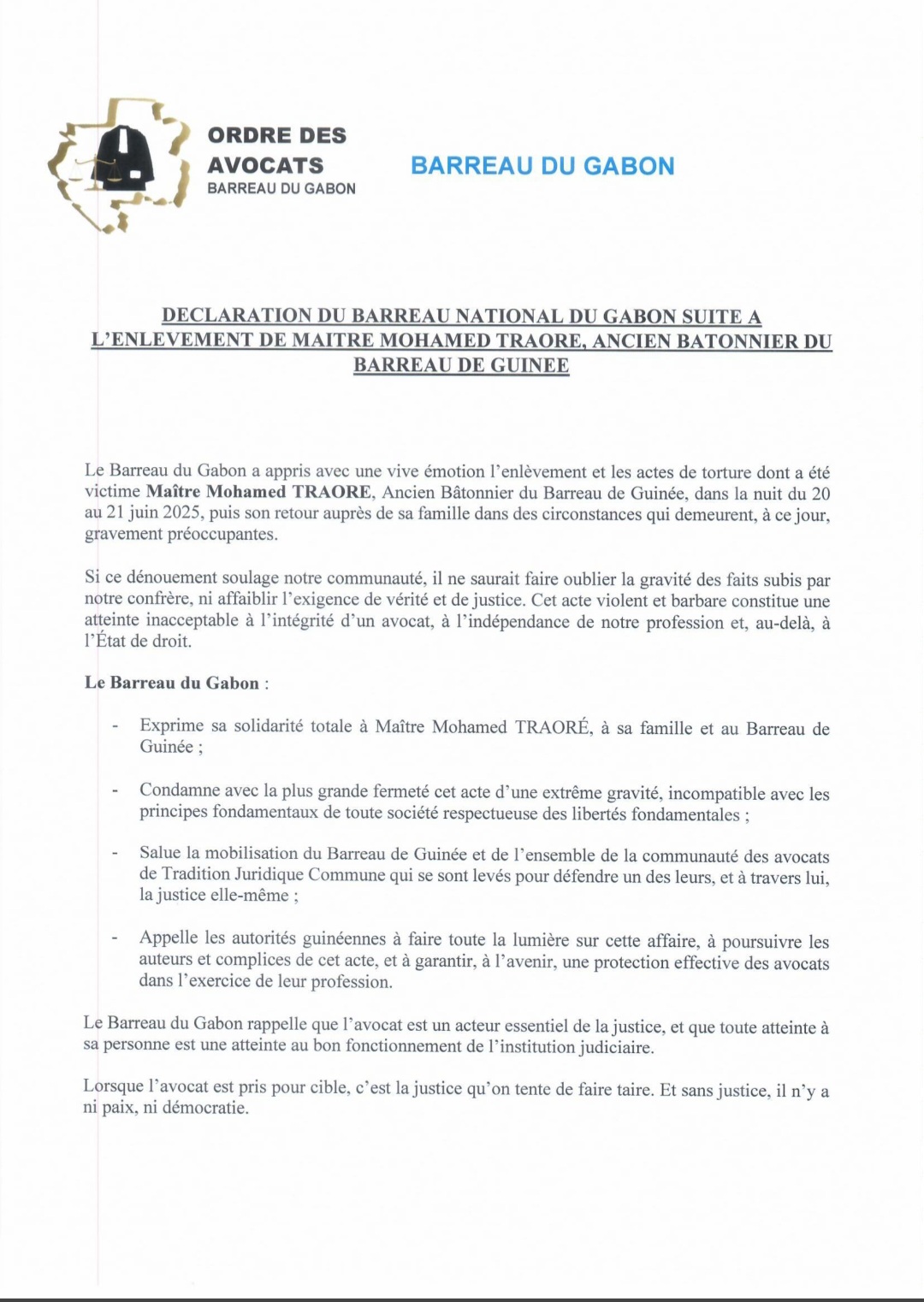 «  Cet acte violent et barbare constitue une atteinte inacceptable à l’intégrité d’un avocat, à l’indépendance de notre profession. Le barreau du Gabon exprime sa solidarité totale à Maître Mohamed Traoré, à sa famille et au Barreau de Guinée, condamne avec la plus grande fermeté cet acte d’une extrême gravité, incompatible avec les principes fondamentaux de toute société respectueuse des libertés fondamentales. Notre association salue la mobilisation du Barreau de Guinée et de l’ensemble de la communauté des avocats de Tradition Juridique Commune qui se sont levés pour défendre un des leurs », dénonce le barreau du Gabon.