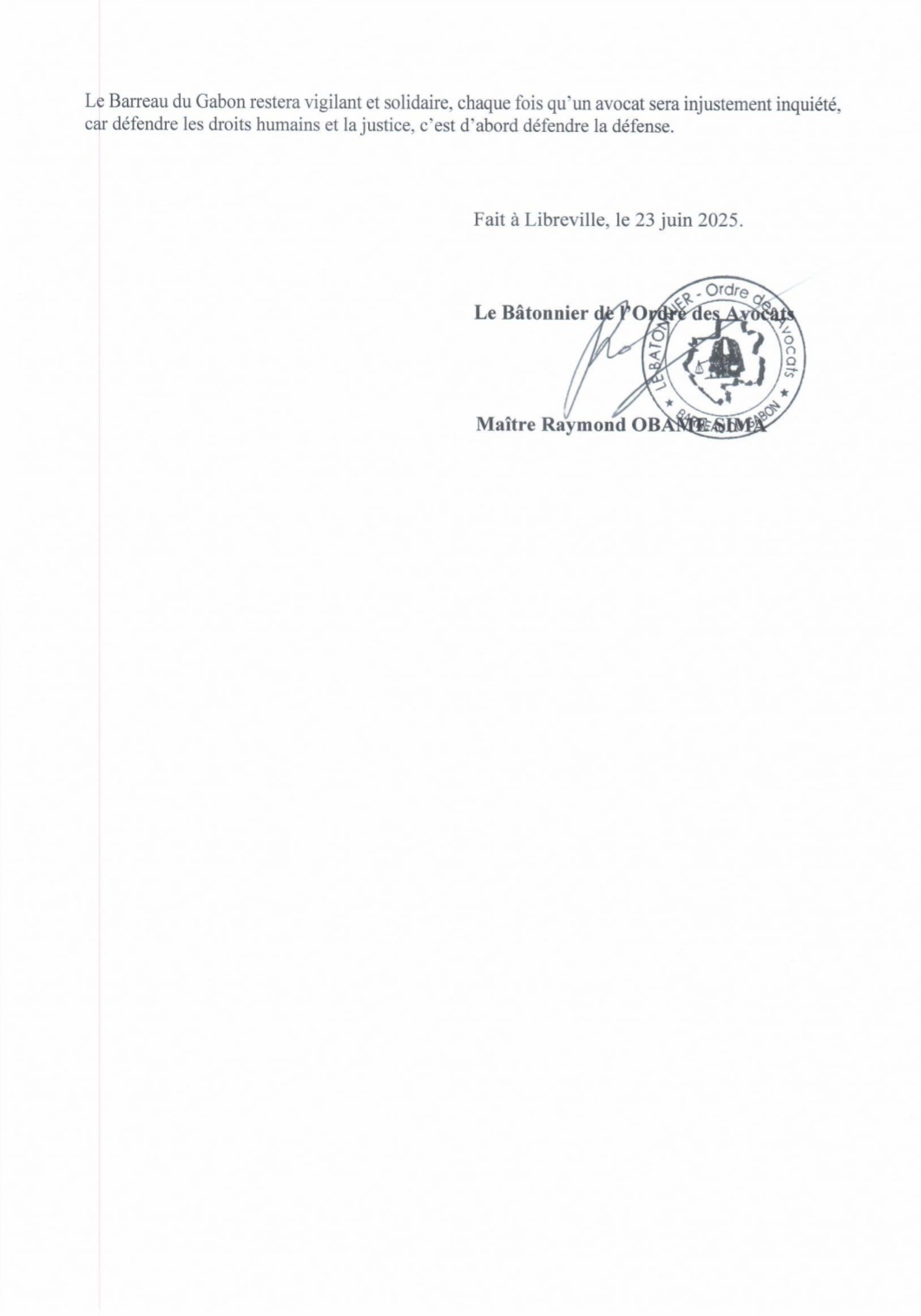 Ci-dessous, la déclaration du Barreau du Gabon: