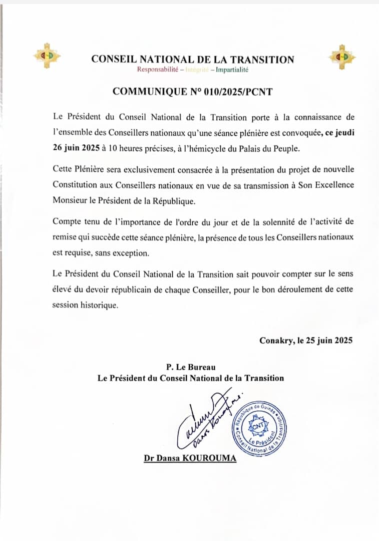 Le Conseil National de la Transition (CNT) franchit une nouvelle étape clé dans le processus de refondation institutionnelle en Guinée. À travers un communiqué officiel publié le 25 juin 2025, le président de l’institution, Dr Dansa Kourouma, convoque l’ensemble des Conseillers nationaux à une plénière exceptionnelle e jeudi 26 juin à 10 heures précises, à l’hémicycle du Palais du Peuple.