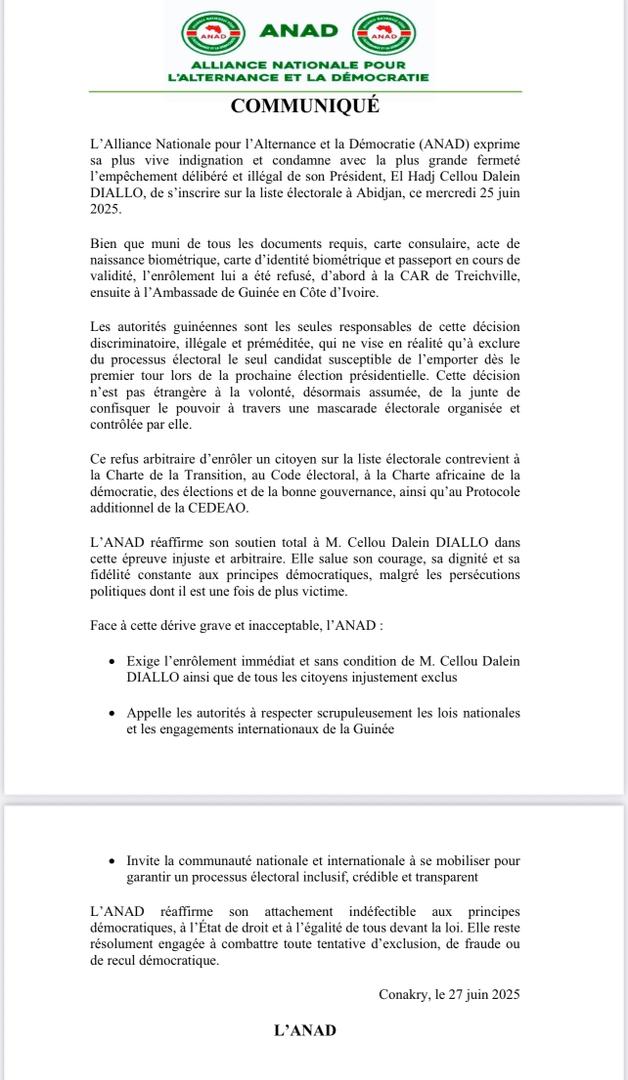 L’Alliance Nationale pour l’Alternance et la Démocratie (ANAD) réagit vigoureusement à l’empêchement de l’opposant Cellou Dalein Diallo de se faire enrôler à Abidjan dans le cadre du PN-RAVEC.
