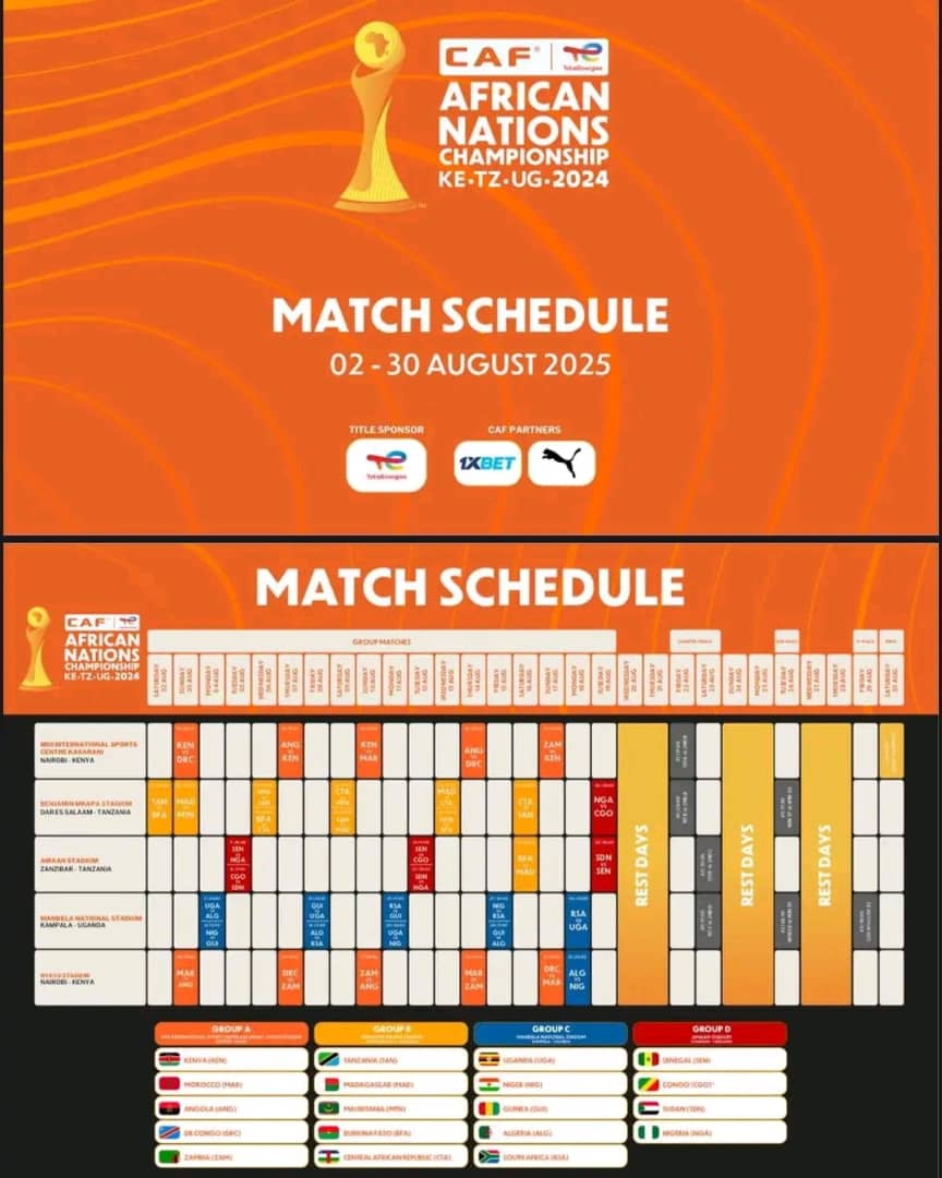 Le match d’ouverture se tiendra le samedi 2 août 2025 à Dar es Salaam. La Tanzanie, l’un des pays coorganisateurs, ouvrira le bal face au Burkina Faso au stade Benjamin Mkapa à 20h00 (heure locale), soit 17h00 GMT. Un duel attendu qui donnera le ton d’un mois de compétition prometteur.