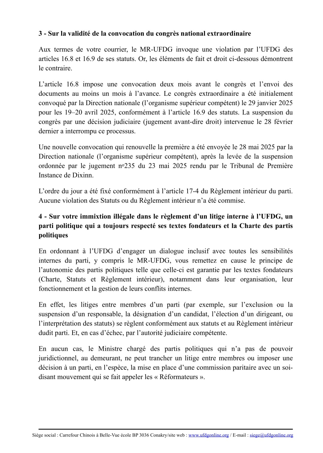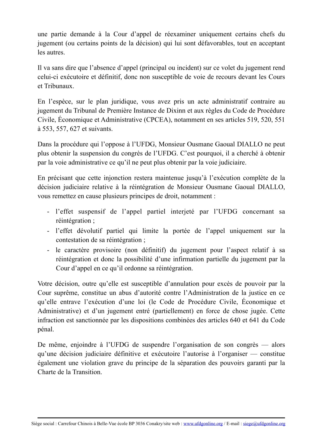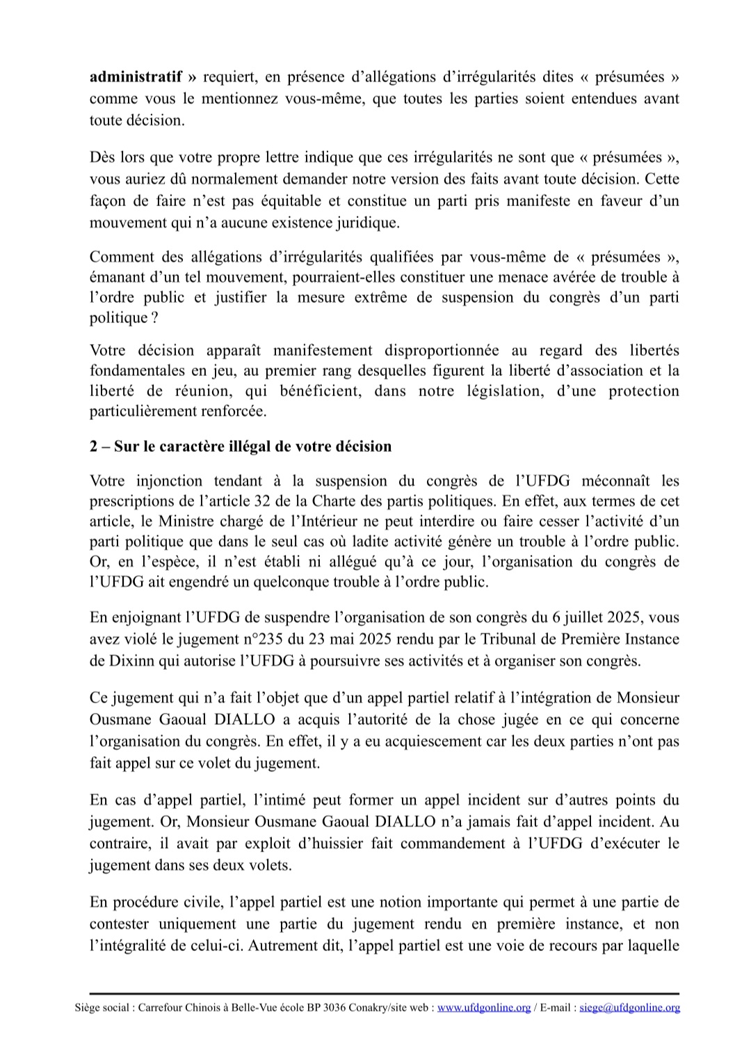 Dans une lettre au ton ferme adressée au ministère, le leader de l’UFDG dénonce une ingérence illégale et un parti pris manifeste en faveur d’un courant dissident, le Mouvement des Réformateurs de l’UFDG (MR-UFDG). Il invoque la régularité du processus et rappelle que seule la justice peut décider d’un report éventuel.