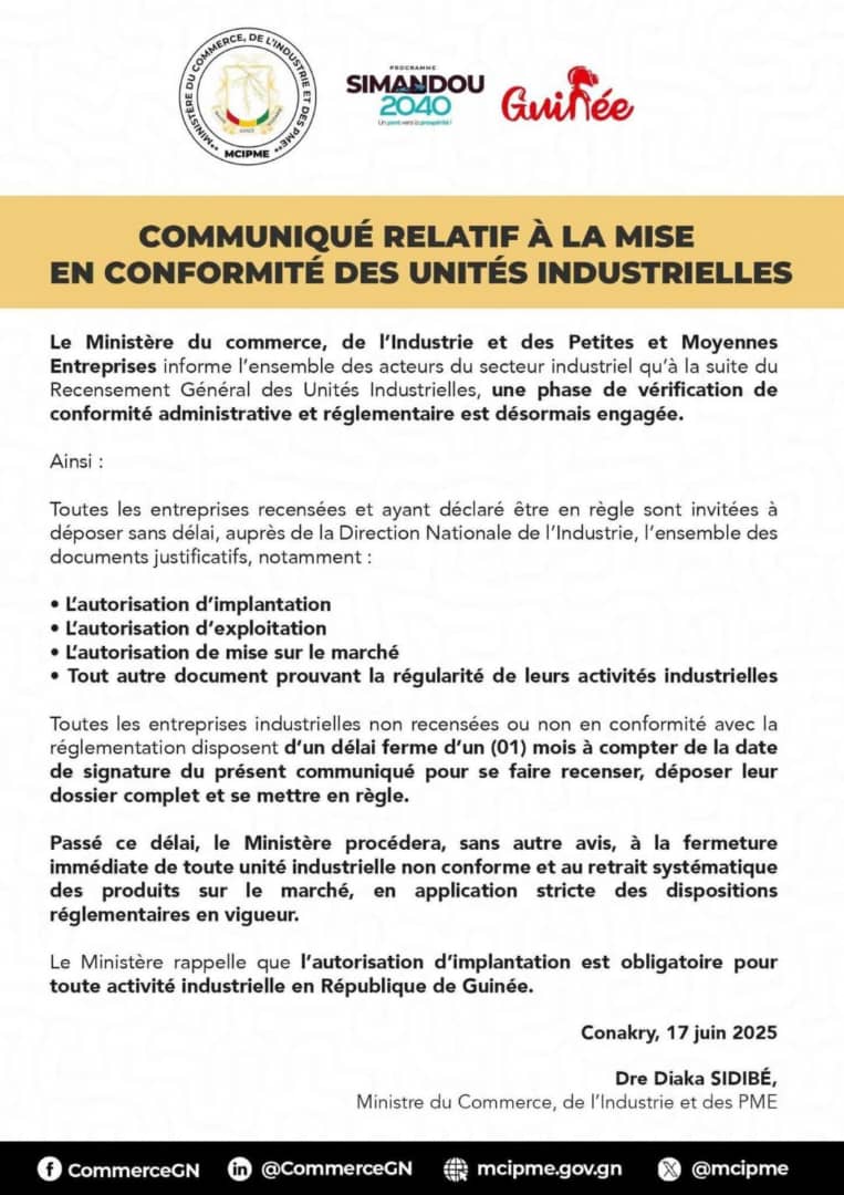 Le Ministère du Commerce hausse le ton contre les unités industrielles non conformes. Dans un communiqué, il accorde un délai d’un mois aux entreprises pour régulariser leur situation administrative auprès de la Direction Nationale de l’Industrie.