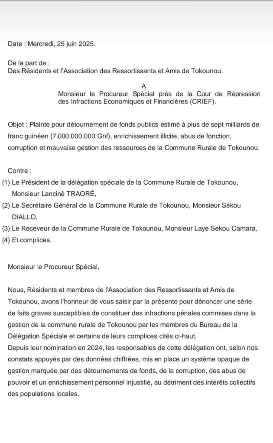 Des résidents et ressortissants sont en colère dans la commune rurale de Tokounou, dans la préfecture de Kankan. En effet, dans une plainte officielle datée du mercredi 25 juin 2025, les Résidents et l’Association des Ressortissants et Amis de Tokounou ont saisi le Procureur Spécial près la Cour de Répression des Infractions Économiques et Financières (CRIEF). En cause, des malversations financières impliquant plusieurs responsables de la délégation spéciale de la commune rurale.