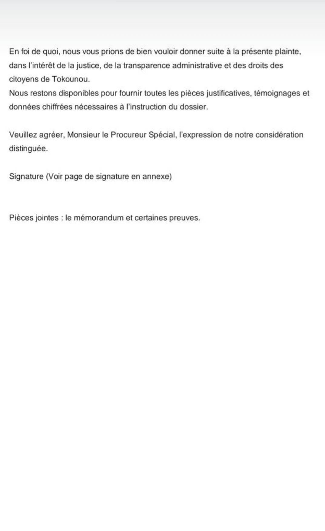 Les auteurs de la plainte appellent les autorités judiciaires à ouvrir une enquête, au nom de la transparence administrative, de la justice et des droits des citoyens de Tokounou.