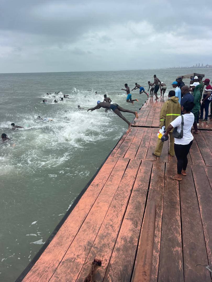Des jeunes nageurs se jetant dans l’eau Ă  la faveur du championnat de Natation organisĂ© Ă  Kassa.