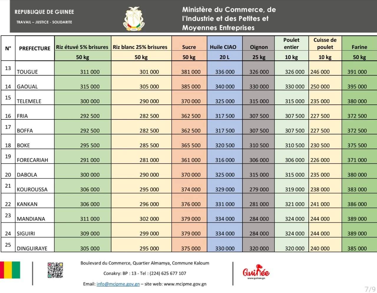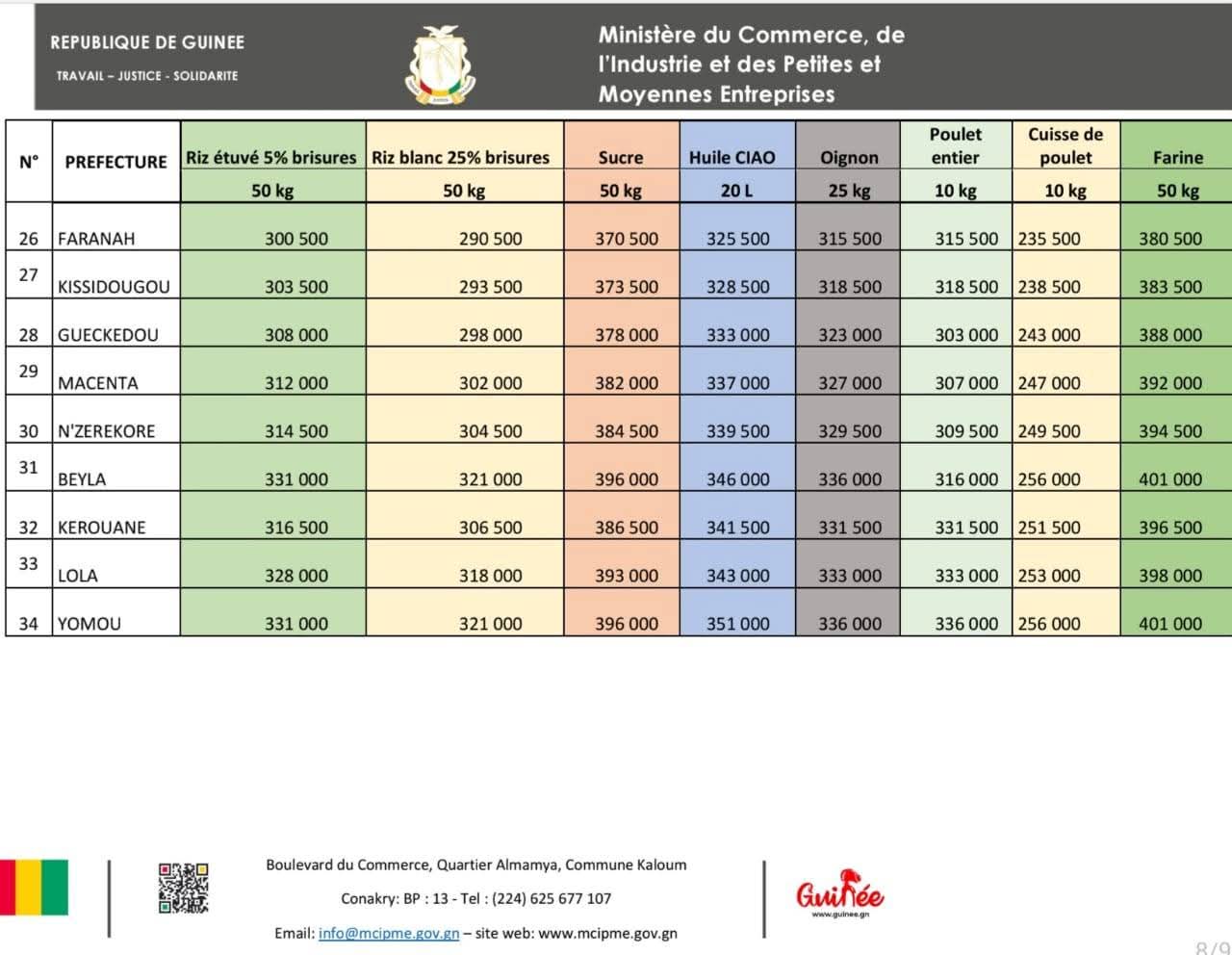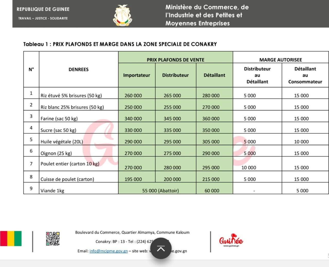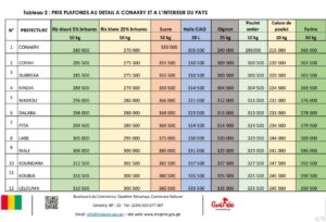 Désormais, dans la zone spéciale de Conakry, le bidon d’huile végétale de 20 litres est plafonné à 305 000 GNF, le sac de 50 kg de riz étuvé à 280 000 GNF, la farine à 360 000 GNF, et le kilogramme de viande à 60 000 GNF.