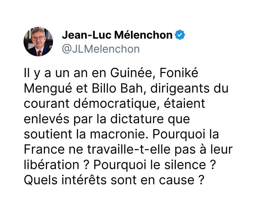 « Il y a un an en Guinée, Foniké Mengué et Billo Bah, dirigeants du courant démocratique, étaient enlevés par la dictature que soutient la macronie. Pourquoi la France ne travaille-t-elle pas à leur libération ? Pourquoi le silence ? Quels intérêts sont en cause ? », s’interroge Jean Luc Mélanchon.