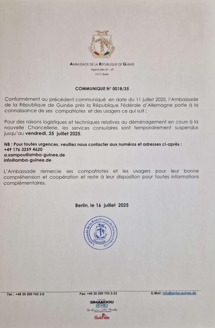 Dans un communiqué rendu public ce mercredi 16 juillet, l’Ambassade de la République de Guinée près la République fédérale d’Allemagne porte à la connaissance de ses compatriotes et des usagers, la suspension temporaire des services consulaires jusqu’au vendredi 25 juillet 2025. L’ambassade annonce que cette interruption de service est dûe à des raisons logistiques et techniques relatives au déménagement.