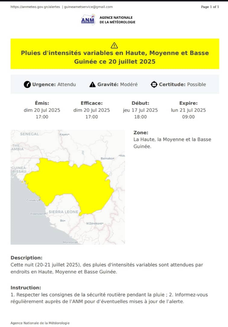 Selon les prévisions de l’Agence Nationale de la Météorologie (ANM), des averses d’intensités variables sont attendues dans les régions de la Haute, Moyenne et Basse Guinée durant la nuit de ce dimanche 20 au lundi 21 juillet 2025. Le bulletin publié ce jour évoque un niveau d’urgence jugé « attendu », une gravité « modérée » et une probabilité d’occurrence « possible ».