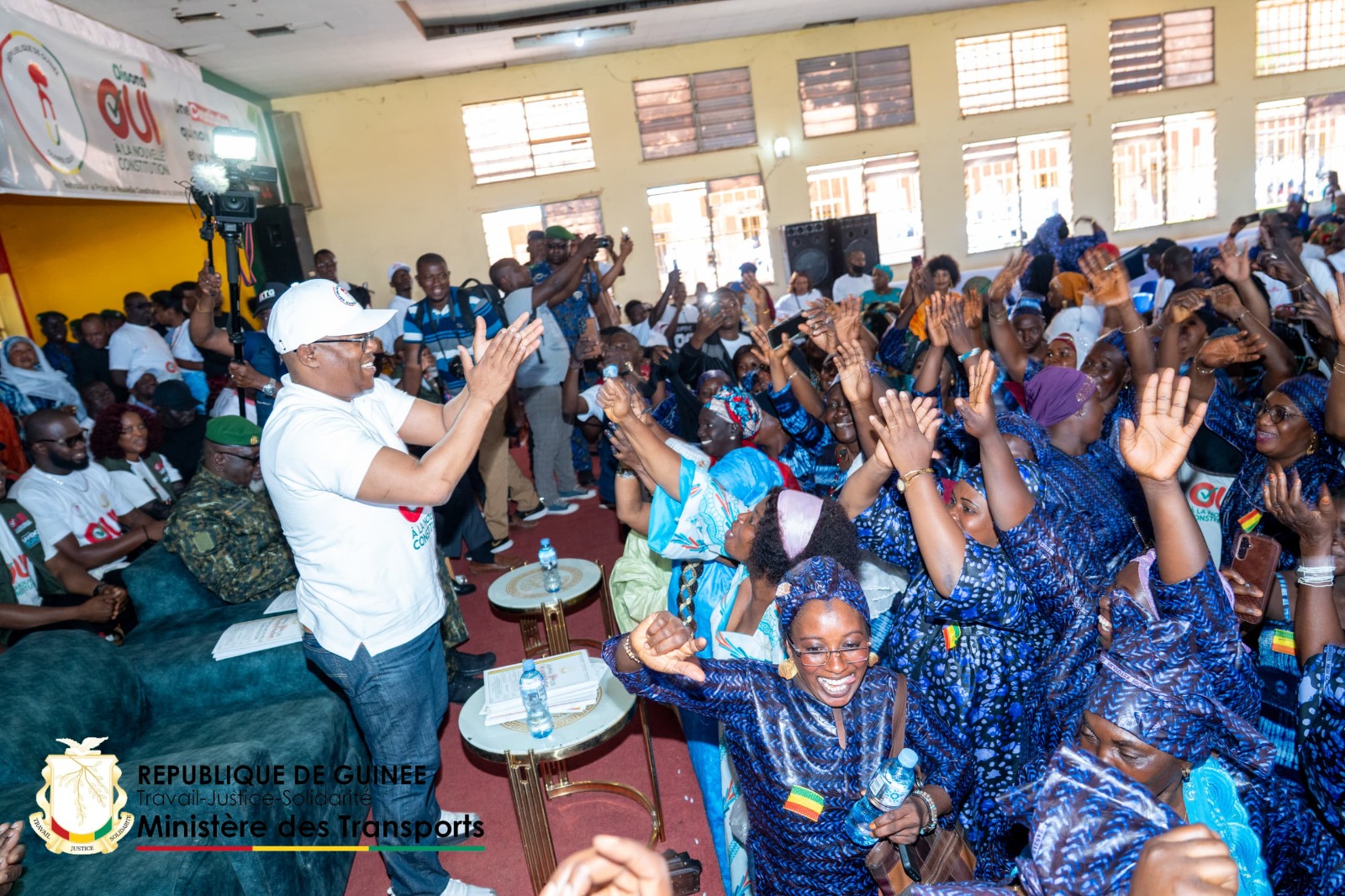 Les cadres qui l’accompagnement étaient reconnaissables à leurs gilets de campagne, affichant également la mention « OUI à la nouvelle Constitution » associée au visuel Simandou 2040, rappelant les grands projets structurants portés par l’État et la vision de développement à long terme. Ce marquage double institutionnel a facilité l’identification des relais officiels dans la foule.