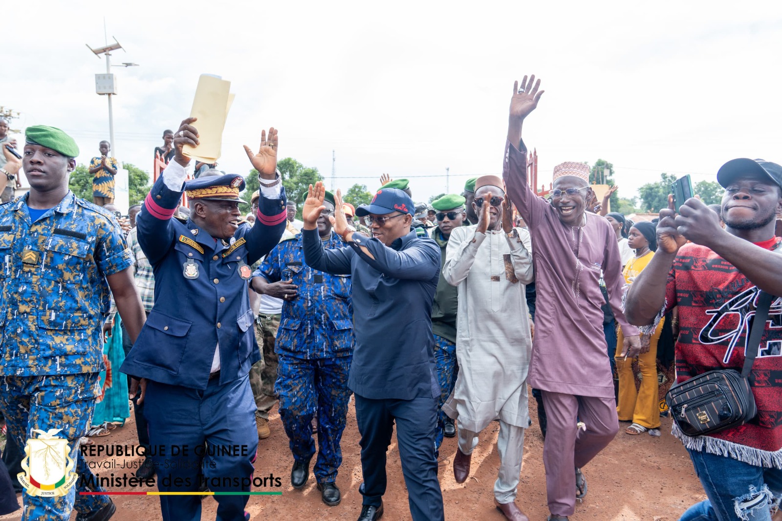 Sur le terrain, Ousmane Gaoual Diallo portait une tenue bleu nuit unie : tunique à patte de boutonnage frontale et fin liseré ton-sur-ton, pantalon assorti. Chaussures noires cirées. Casquette bleu foncé ornée d’un marquage rouge, lunettes fumées, montre poignet gauche. Une présentation simple et fonctionnelle, adaptée au déplacement routier comme aux rencontres publiques. Son choix de rester debout, au même niveau que les citoyens lors de plusieurs arrêts intermédiaires, a renforcé la perception de proximité.