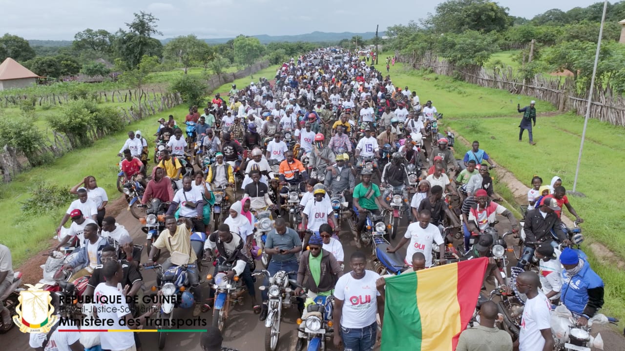 À l’approche de la ville, la route était déjà occupée. Des groupes de motards ouvraient la voie, moteurs lancés, klaxons répétés en rafale pour signaler le passage de la délégation. Des femmes alignées au bord de la chaussée entonnaient des chants d’accueil, accompagnés de cris de joie. Plusieurs jeunes portaient des tee-shirts blancs imprimés d’un large « OUI » en rouge, suivi de la mention « à la nouvelle Constitution » en dessous : visuel simple, lisible, répété dans la foule comme un mot d’ordre.