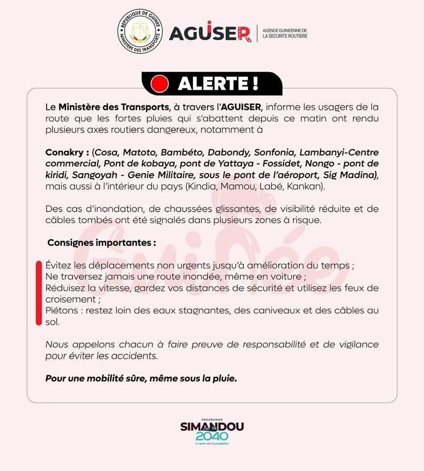 Face aux pluies diluviennes qui s’abattent ce samedi 26 juillet 2025, sur Conakry et plusieurs villes de l’intérieur du pays, le ministère des transports, à travers l’agence Guinéenne de la sécurité routière (AGUISER), lance une alerte à tous les usagers de la route. Objectif, prévenir les risques d’accidents liés aux inondations, à la mauvaise visibilité et à l’état glissant de la chaussée.