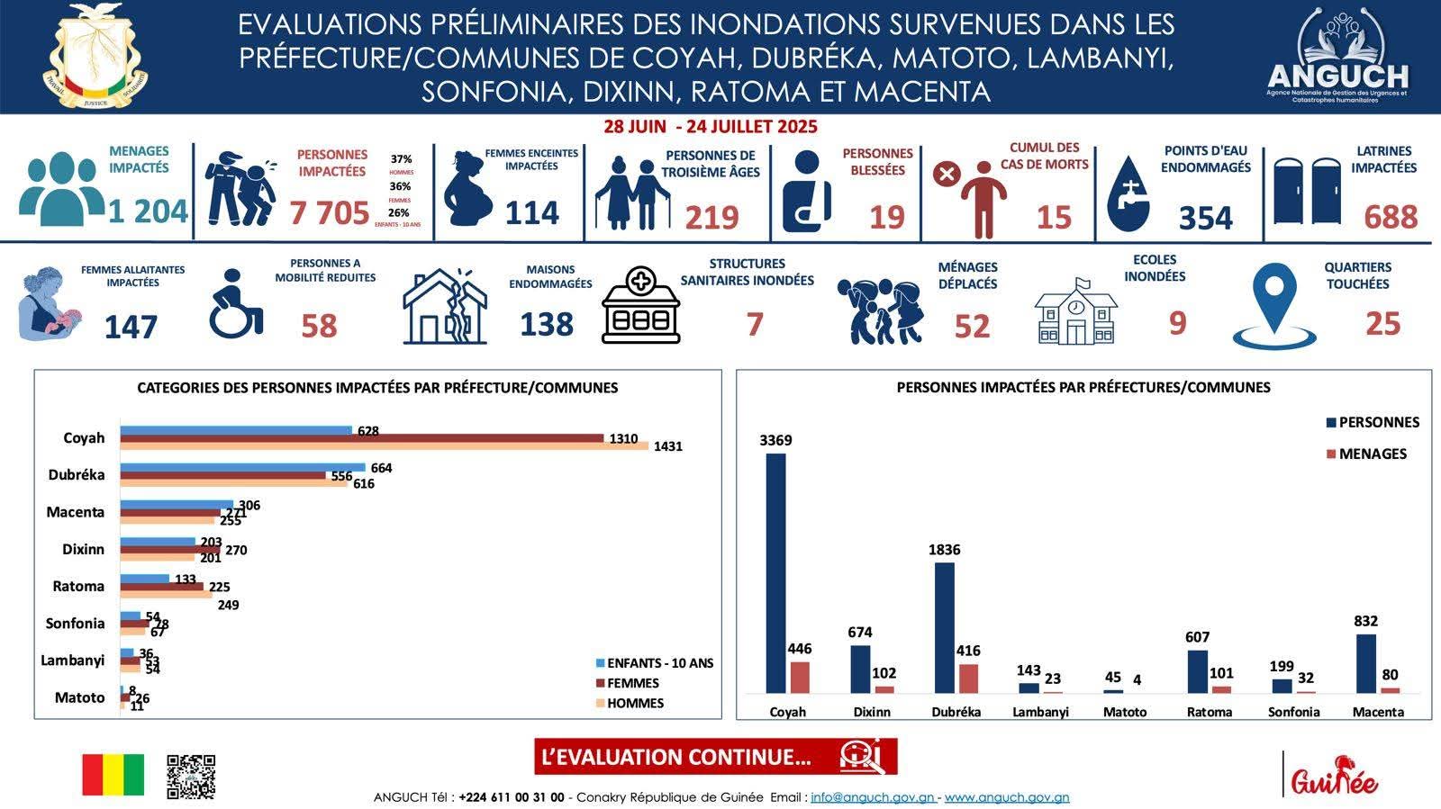 Entre le 28 juin et le 24 juillet 2025, de fortes inondations ont touché Coyah, Dubréka, Matoto, Lambanyi, Sonfonia, Dixinn, Ratoma et Macenta.