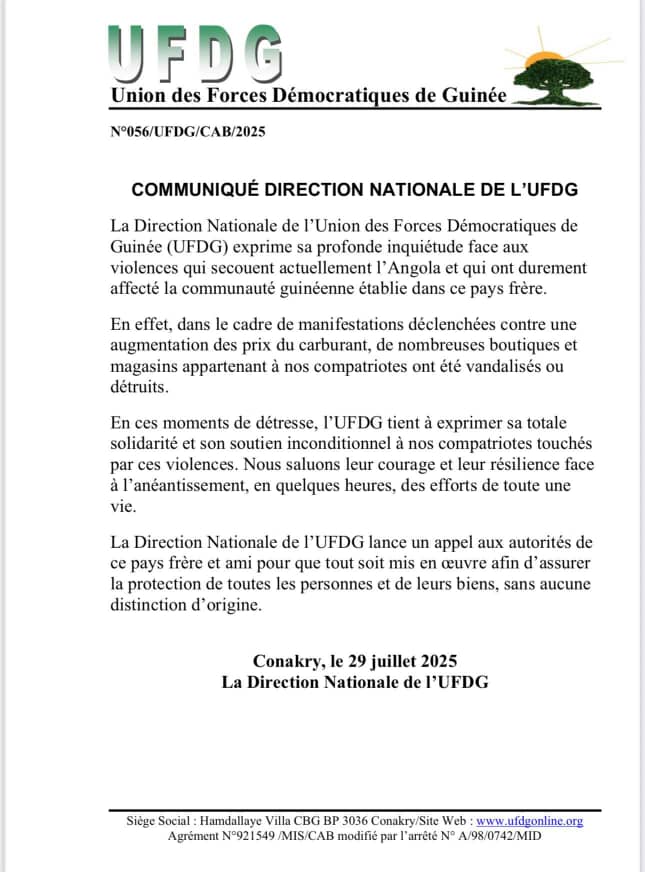 À la suite des récentes violences en Angola, survenues lors de manifestations contre la hausse du prix du carburant, l’Union des Forces Démocratiques de Guinée (UFDG) exprime sa profonde inquiétude et sa solidarité envers la communauté guinéenne durement touchée.
