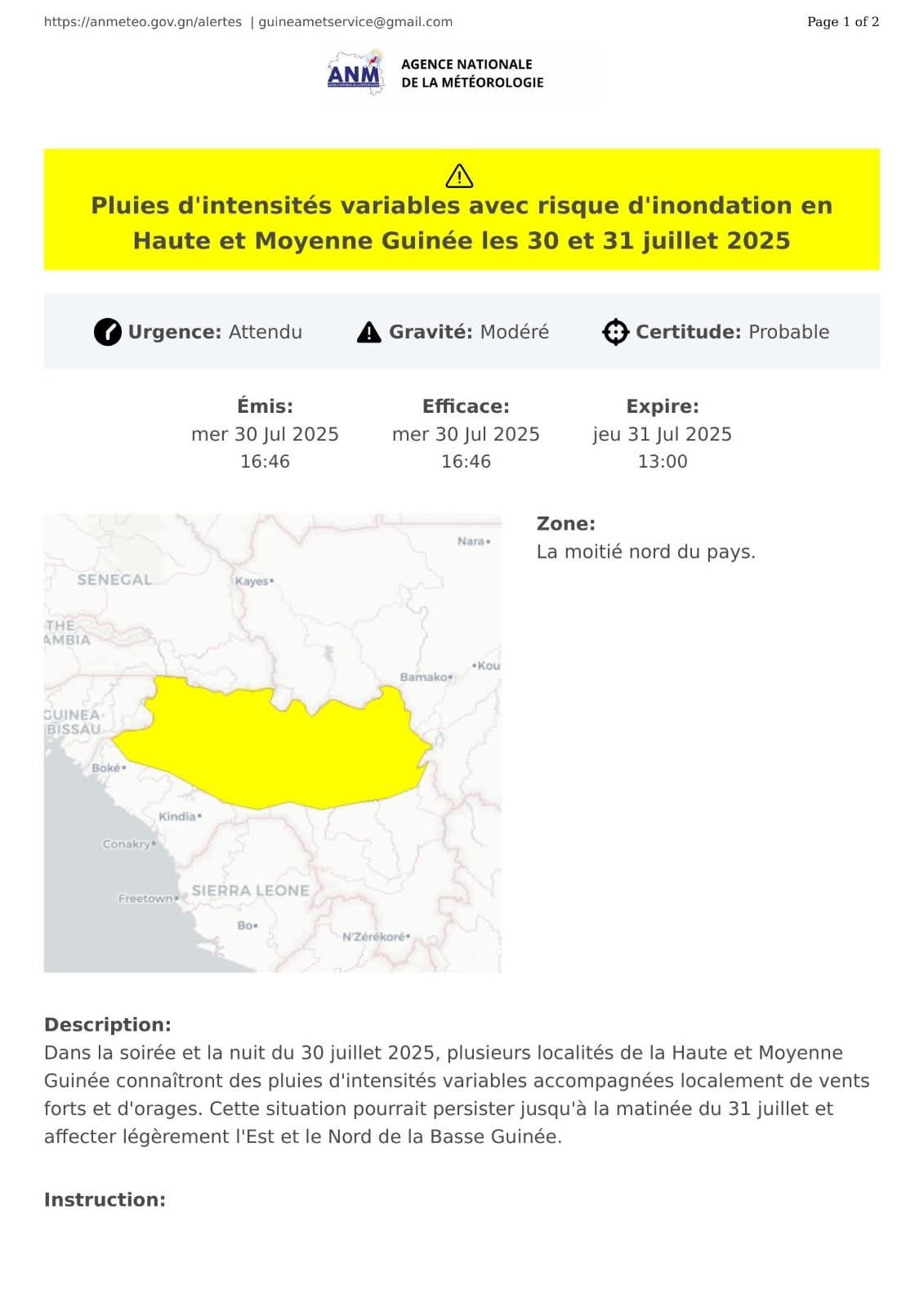 L’Agence Nationale de la Météorologie (ANM) a émis, ce mercredi 30 juillet 2025, une alerte concernant des pluies d’intensités variables attendues dans plusieurs localités de la Haute et de la Moyenne Guinée. Ces précipitations, parfois accompagnées de vents forts et d’orages, devraient débuter dans la soirée du 30 juillet et se prolonger jusqu’à la matinée du 31 juillet.