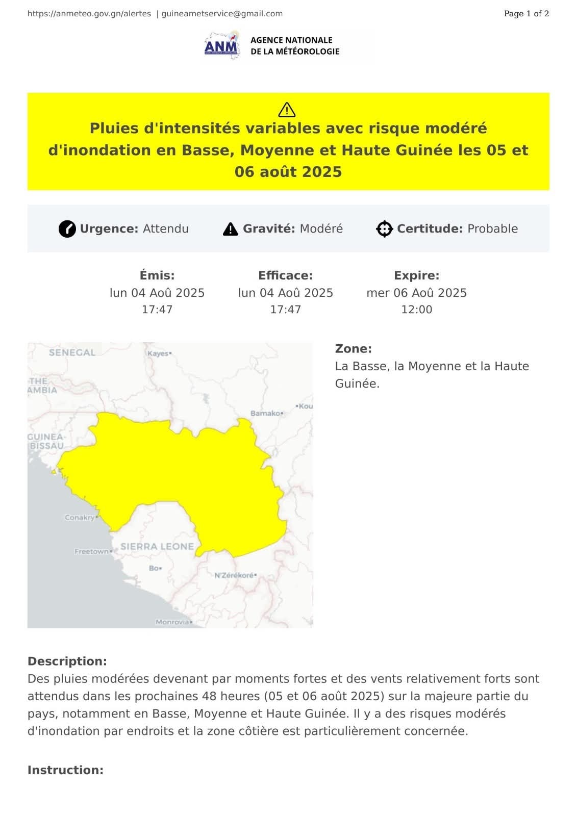 Des pluies d’intensités variables, parfois fortes, accompagnées de vents soutenus, sont attendues les 5 et 6 août 2025 sur l’ensemble de la Basse, Moyenne et Haute Guinée. L’alerte, de gravité modérée mais à forte probabilité, signale un risque accru d’inondation, en particulier dans les zones côtières déjà fragilisées.