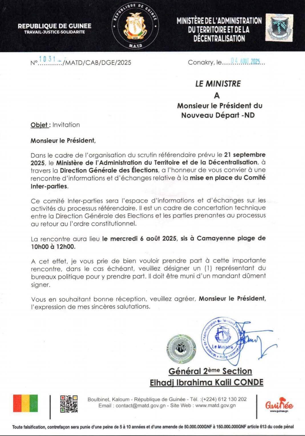 C’est dans ce cadre qu’il convie ce mercredi 06 août 2025 les partis politiques à une importante rencontre à Camayenne. Celle-ci va porter essentiellement sur la mise en place du comité inter-parties. La Direction Générale des Élections échangera avec les formations politiques à ce sujet.