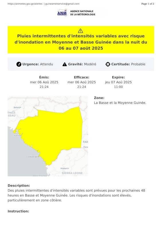 Après les violentes intempéries qui ont endeuillé Conakry dans la nuit du 30 au 31 juillet, une nouvelle alerte vient raviver l’inquiétude. Ce mercredi 6 août 2025, l’Agence Nationale de la Météorologie (ANM) annonce l’arrivée des pluies intermittentes, d’intensités variables, sur la Basse et la Moyenne-Guinée.