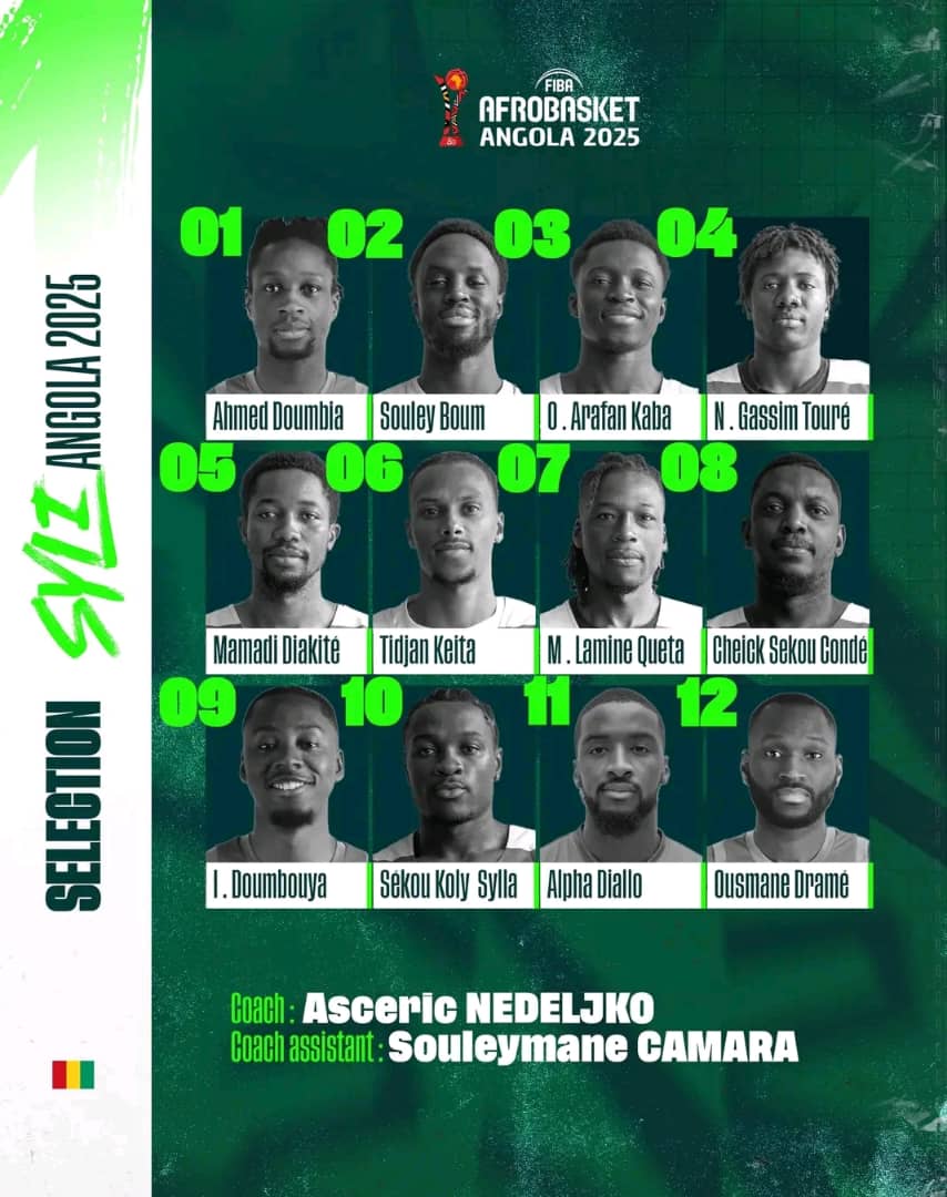 Le sélectionneur Asceric Nedeljko a rendu publique la liste définitive de la Guinée pour l’AfroBasket Angola 2025. Douze joueurs ont été retenus avec une surprise : la présence du jeune meneur Nour Gassim Touré, appelé à tenir un rôle clé en l’absence de Shanon Evans et Abdoulaye Sy.