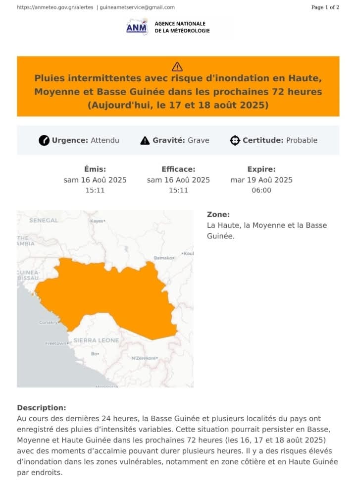 Les localités côtières de la Basse Guinée ainsi que certaines parties de la Haute Guinée sont particulièrement exposées. Bien que des périodes d’accalmie soient attendues, l’intensité variable des précipitations pourrait entraîner des crues soudaines. L’alerte, émise le samedi 16 août à 15h11, restera en vigueur jusqu’au mardi 19 août à 6h.