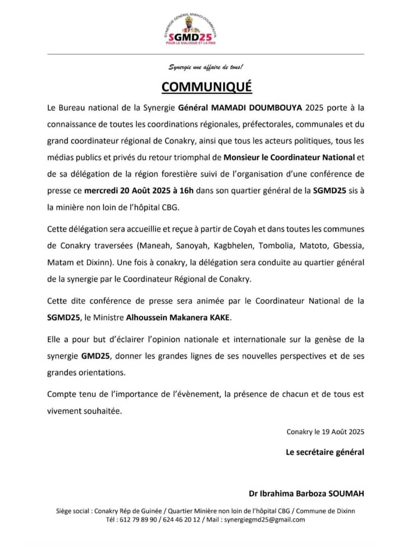 La Synergie GMD25, sous la direction d’Alhoussein Makanéra Kaké, tiendra une conférence de presse ce mercredi 20 août 2025 à 16h, au siège du mouvement situé à la Minière, non loin de l’hôpital CBG.