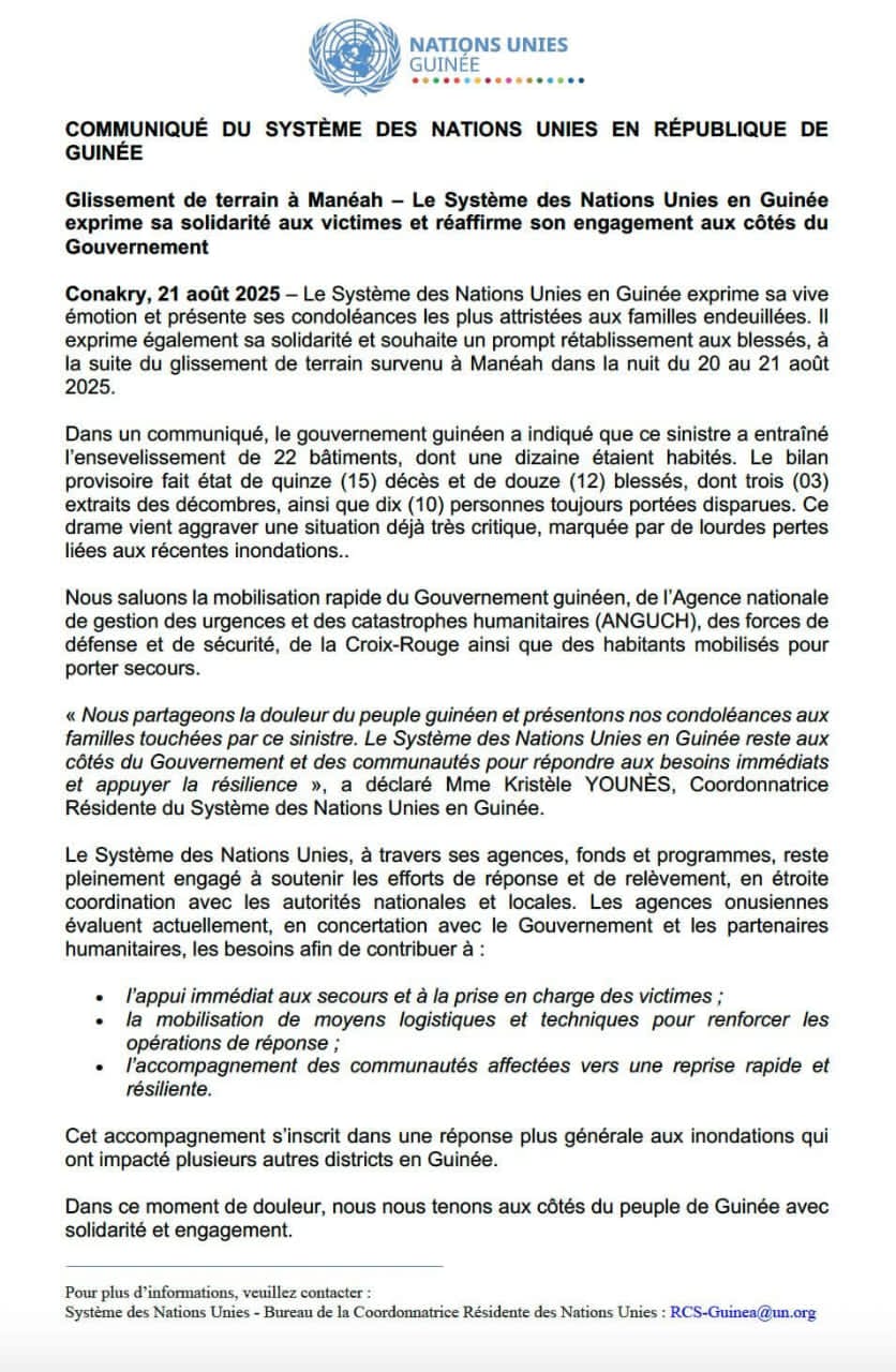À la suite du glissement de terrain meurtrier survenu dans la nuit du 20 au 21 août 2025 à Manéah, le Système des Nations Unies en Guinée a exprimé sa profonde compassion envers les victimes et présenté ses condoléances aux familles touchées.