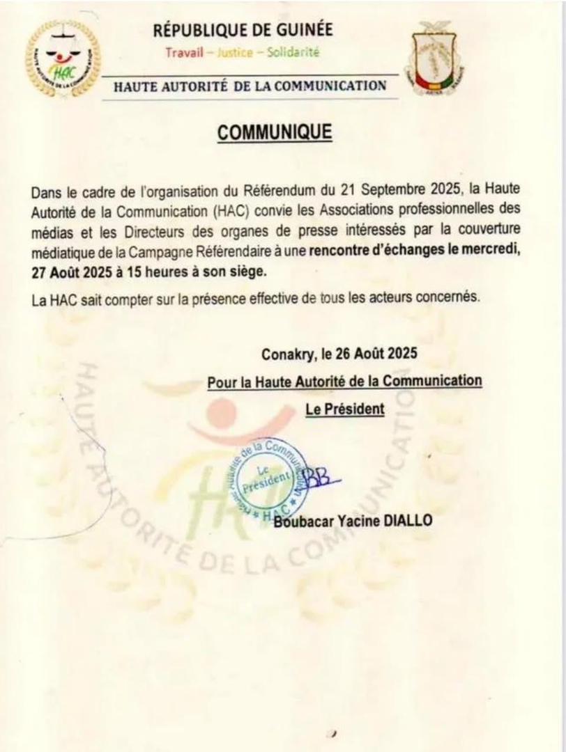 La Haute Autorité de la Communication (HAC) convie les associations professionnelles de médias, ainsi que les directeurs d’organes de presse à une rencontre d’échanges, ce mercredi 27 août 2025, dans ses locaux sis à Kaloum.