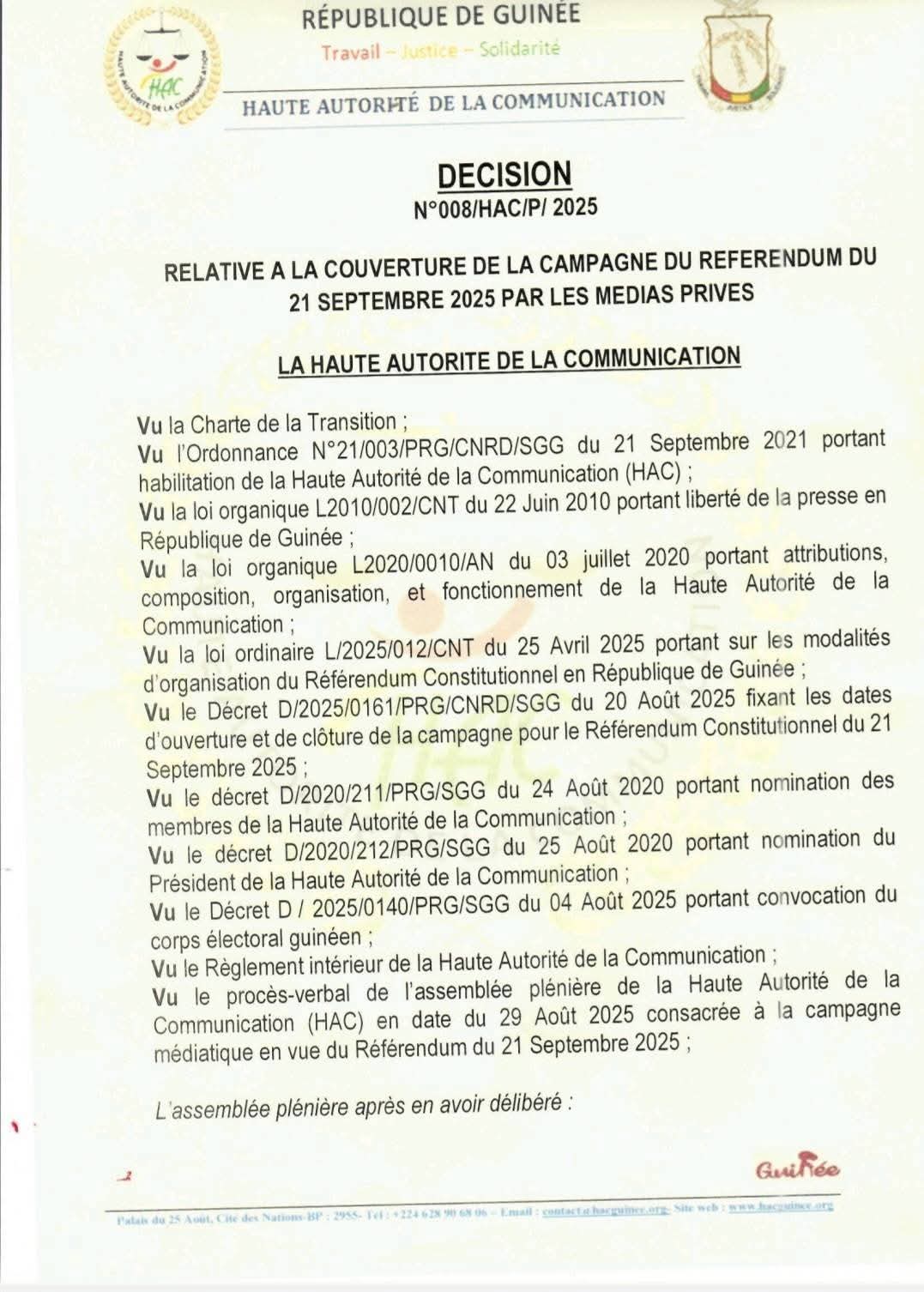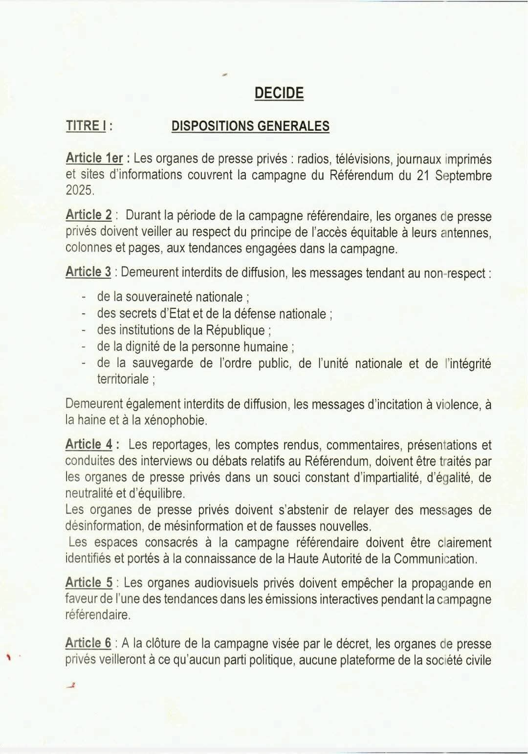 La Haute Autorité de la Communication (HAC) a publié une décision encadrant la couverture médiatique du référendum constitutionnel du 21 septembre 2025. Les médias privés doivent respecter les principes d’« impartialité, d’égalité, de neutralité et d’équilibre » tout au long de la campagne.