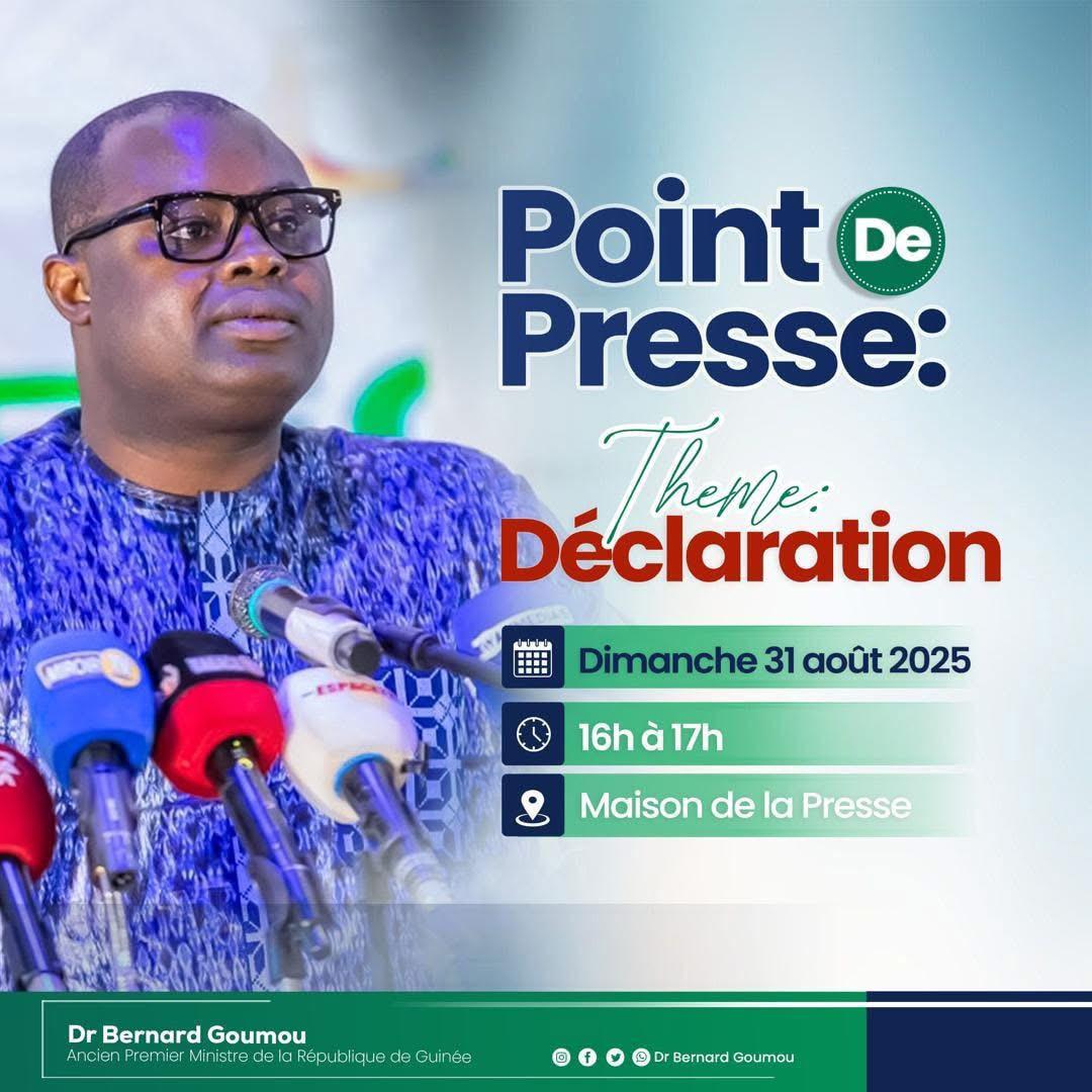 L’ancien Premier ministre, Dr Bernard Goumou, sera face aux journalistes ce dimanche 31 août 2025, à la Maison de la Presse de Conakry, de 16h à 17h. Dans un message adressé aux citoyens, Bernard Goumou a indiqué vouloir saisir cette occasion pour un « moment important de partage », appelant à la présence et à l’attention de tous.
