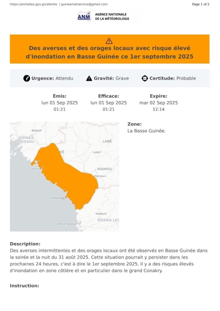 L’Agence Nationale de la Météorologie a émis une alerte grave pour la journée de ce 1er septembre 2025, concernant des averses soutenues et des orages locaux en Basse Guinée.