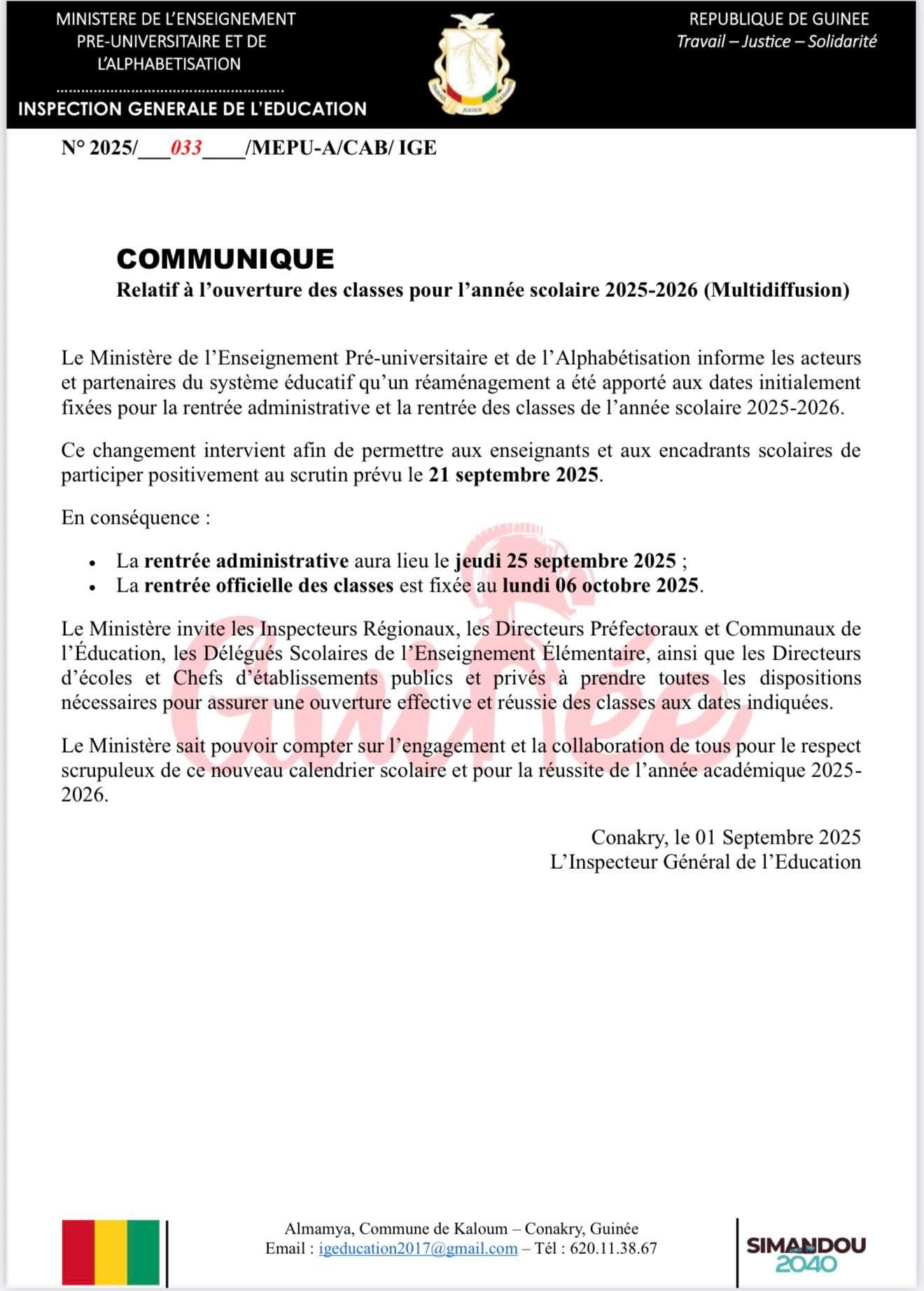 Changement de calendrier pour les écoles guinéennes. Le ministère de l’Enseignement préuniversitaire et de l’Alphabétisation (MEPU-A) a annoncé ce Mardi le report de la rentrée scolaire initialement fixée au 15 septembre 2025.