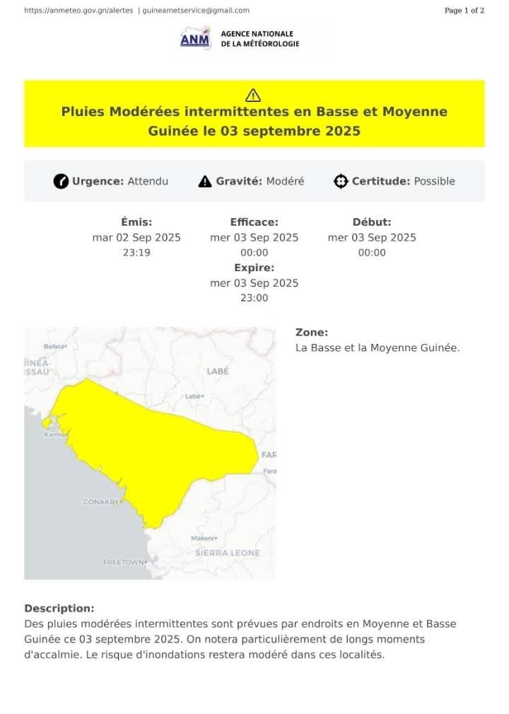 L’Agence Nationale de la Météorologie (ANM) a émis une nouvelle alerte concernant des pluies modérées intermittentes attendues ce mercredi 3 septembre 2025 en Basse et Moyenne Guinée.