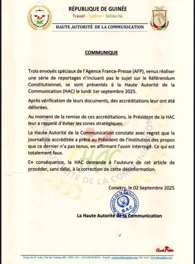 Selon la HAC, la journaliste de l’AFP à l’origine du texte aurait prêté à Boubacar Yacine Diallo des propos qu’il n’a jamais tenus. L’institution parle de « désinformation » et exige une rectification immédiate de l’article mis en cause