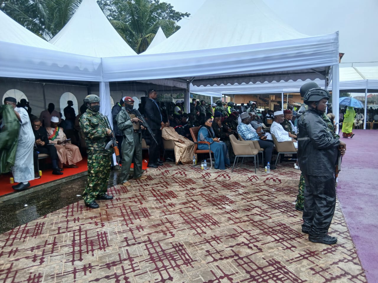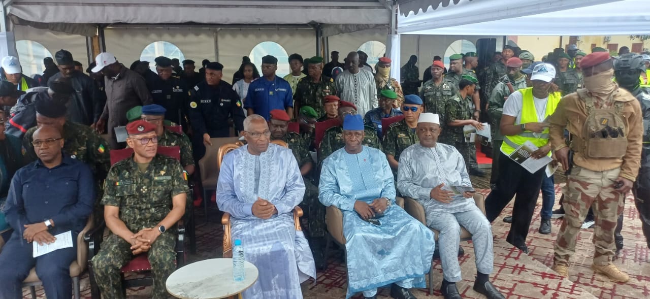 La cérémonie officielle se tient à l’École militaire de Manéah, lieu symbolique de recueillement et de solidarité. Dès les premières heures de la matinée, les autorités guinéennes se sont massivement mobilisées pour accompagner les familles endeuillées. Le Premier ministre Amadou Oury Bah, accompagné de plusieurs membres de son gouvernement, est présent sur les lieux, aux côtés des membres du CNRD, du Chef d’État-major général des armées, le Général Ibrahima Sory Bangoura (BIS), et de nombreux hauts gradés de l’armée.