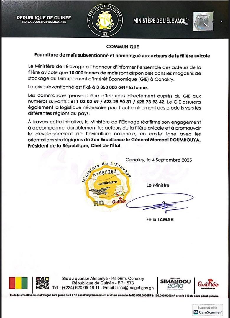 Selon le document, un stock provenant de 10 000 hectares de maïs est désormais disponible dans les magasins de stockage du Groupement d’Intérêt Économique (GEI) à Conakry. Le prix a été fixé à 3 350 000 francs guinéens la tonne, soit un tarif préférentiel visant à alléger les charges des éleveurs.
