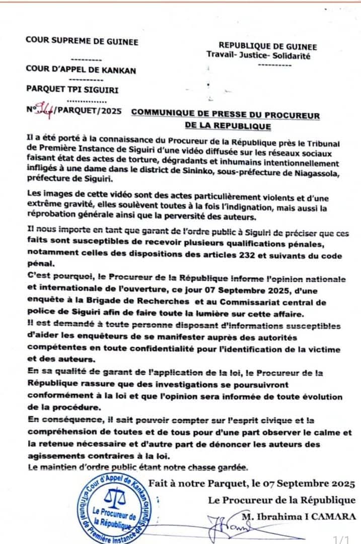 En réaction, le parquet du Tribunal de Première Instance de Siguiri s’est immédiatement autosaisi ce dimanche 7 septembre 2025. Une enquête judiciaire est ouverte, confiée à la Brigade de Recherches et au Commissariat central.