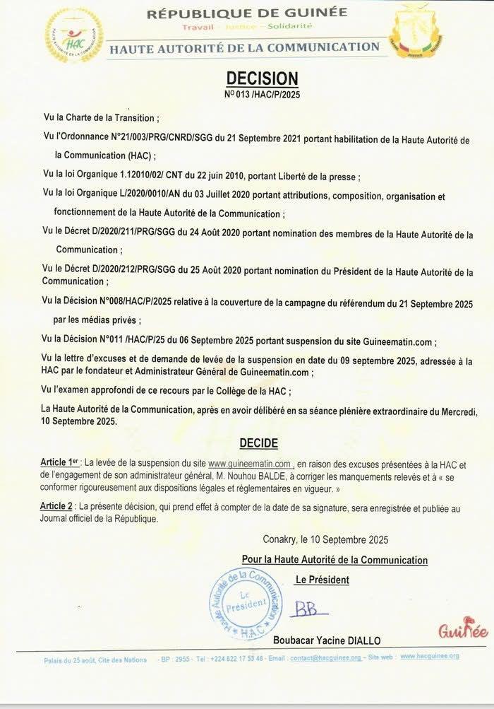 La Haute Autorité de la Communication (HAC) a annoncé, ce mercredi 10 septembre 2025, la levée de la suspension du site d’information GUINEEMATIN.COM. Cette décision intervient après l’examen, en séance plénière extraordinaire, du recours introduit par le fondateur et administrateur général du média, Nouhou Baldé.