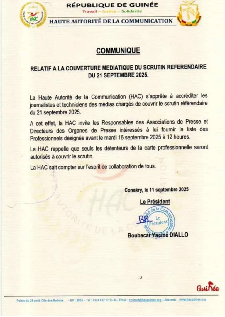 À l’approche du scrutin référendaire prévu le 21 septembre 2025, la Haute Autorité de la Communication (HAC) appelle les associations de presse et organes médiatiques à soumettre, avant le mardi 16 septembre à midi, la liste des journalistes et techniciens désignés pour la couverture de l’événement.