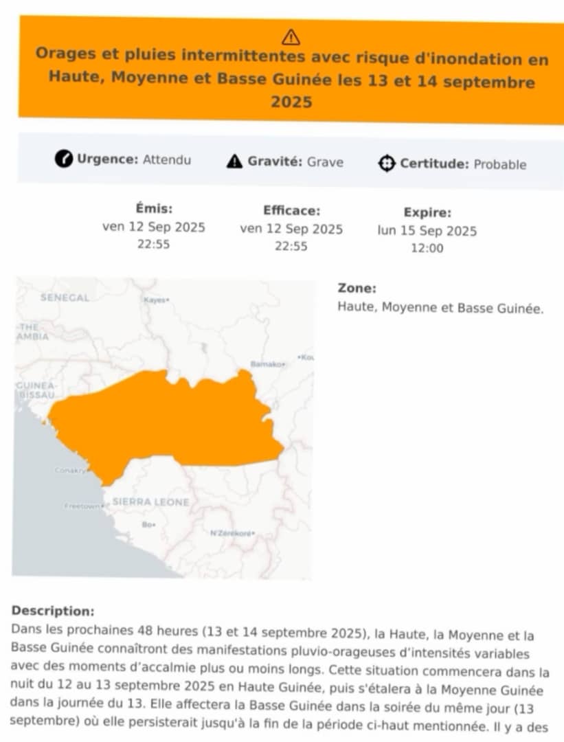 L’Agence Nationale de la Météorologie (ANM) a émis une alerte ce week-end, annonçant des orages et pluies intenses en Haute, Moyenne et Basse Guinée les 13 et 14 septembre 2025.