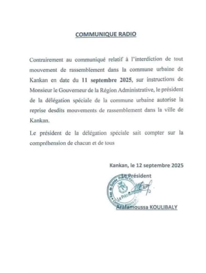 Dans un communiqué publié ce samedi 12 septembre 2025, le président de la délégation spéciale de la commune urbaine de Kankan, Arafamoussa Koulibaly, annonce la reprise des rassemblements publics.