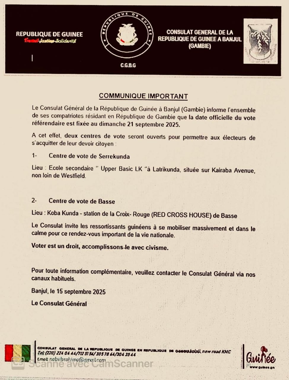 En prélude au référendum constitutionnel prévu le dimanche 21 septembre 2025, le Consulat général de Guinée à Banjul a officiellement annoncé les deux centres de vote pour les ressortissants guinéens vivant en Gambie.