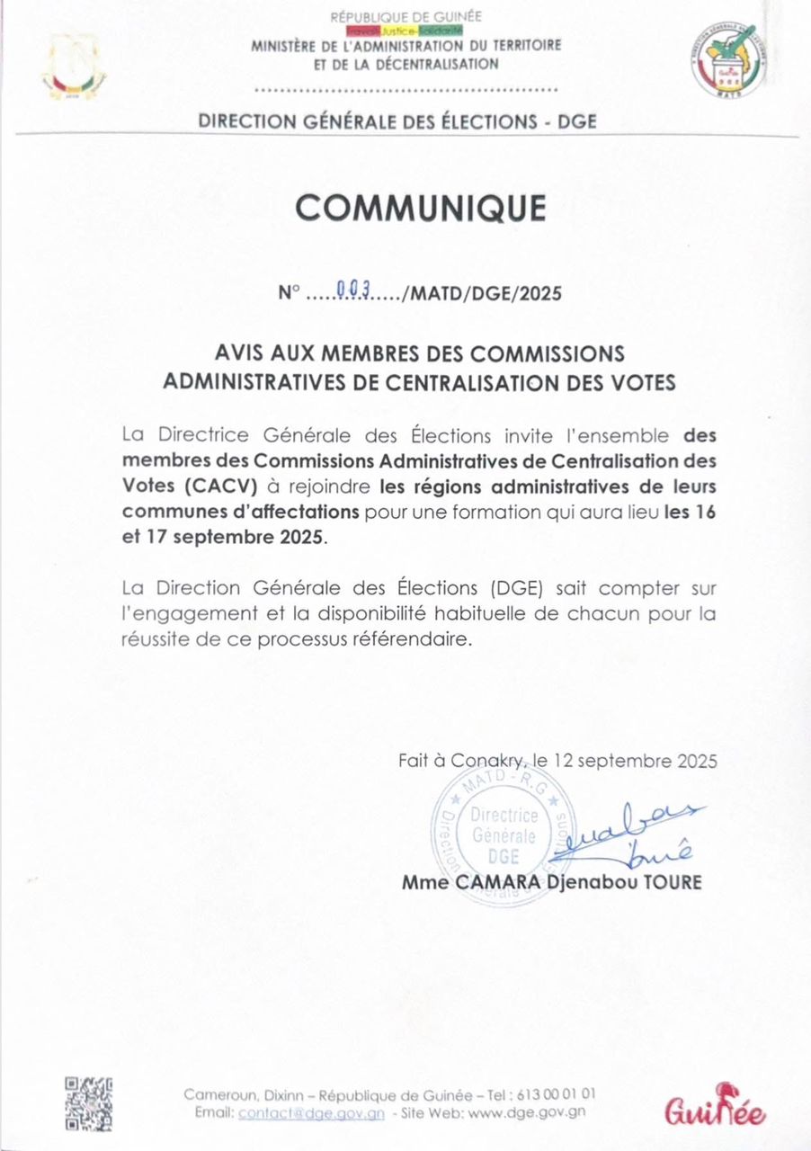 À l’approche du référendum prévu le 21 septembre 2025, la Direction générale des élections (DGE) appelle les membres des Commissions des centres administratifs de centralisation des votes (CACV) à se rendre dans les régions administratives correspondant à leurs communes d’affectation.