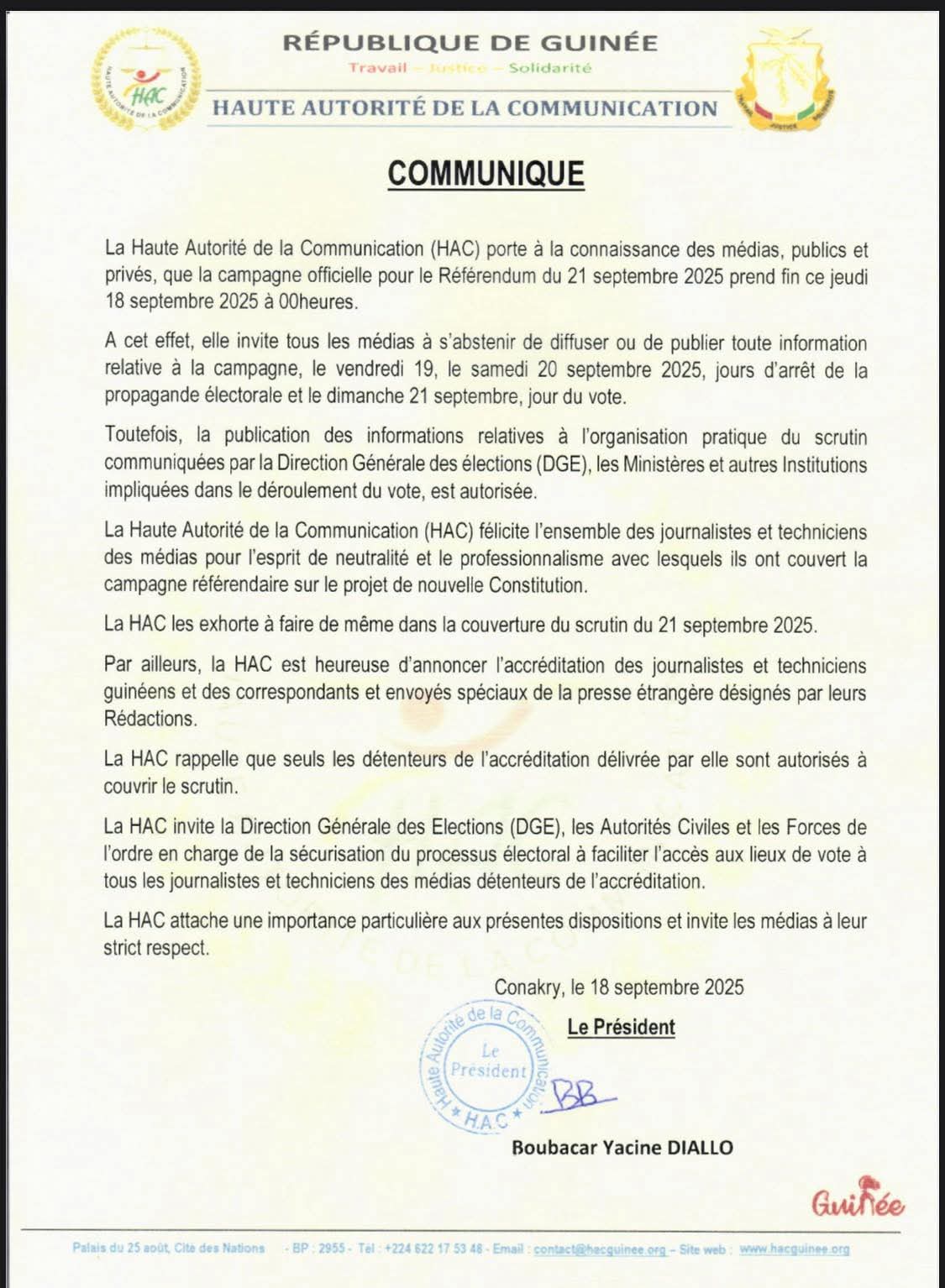 La Haute Autorité de la Communication (HAC) annonce la fin officielle de la campagne référendaire ce jeudi 18 septembre à 00 h. À partir de cette heure, toute publication ou diffusion de messages à caractère électoral est formellement interdite.